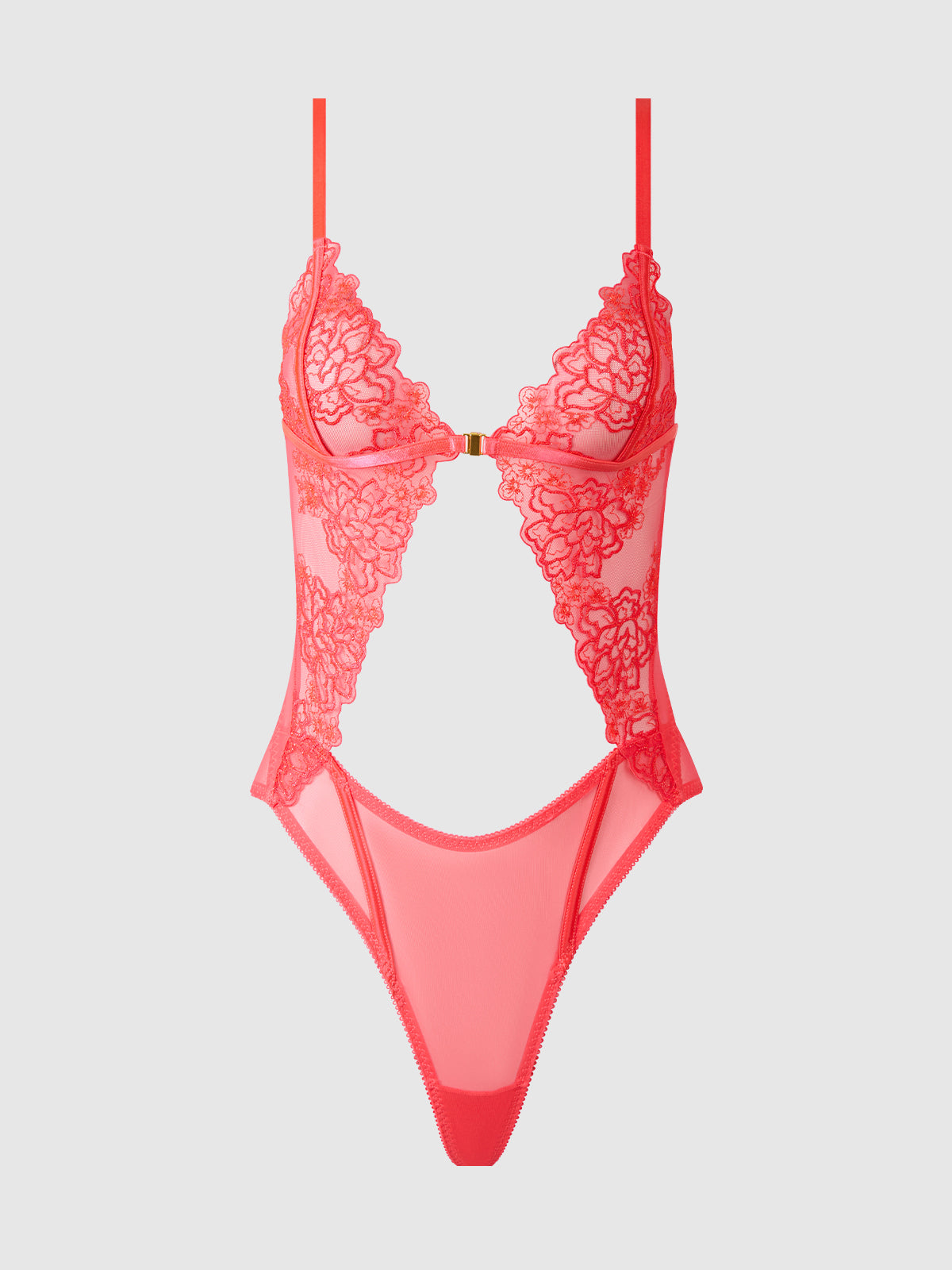 In our lingerie paradise, florals are always in season. Slip on the Eden Embroidered Wirefree Teddy and awaken goddess energy. Crafted with gorgeous floral lace and luxe satin fabric, this sexy one-piece lingerie shows you off with its deep V-neckline, sheer triangle cups, and daring front and back cutouts. With a high-cut g-string bottom, you’re sure to look good in every angle.