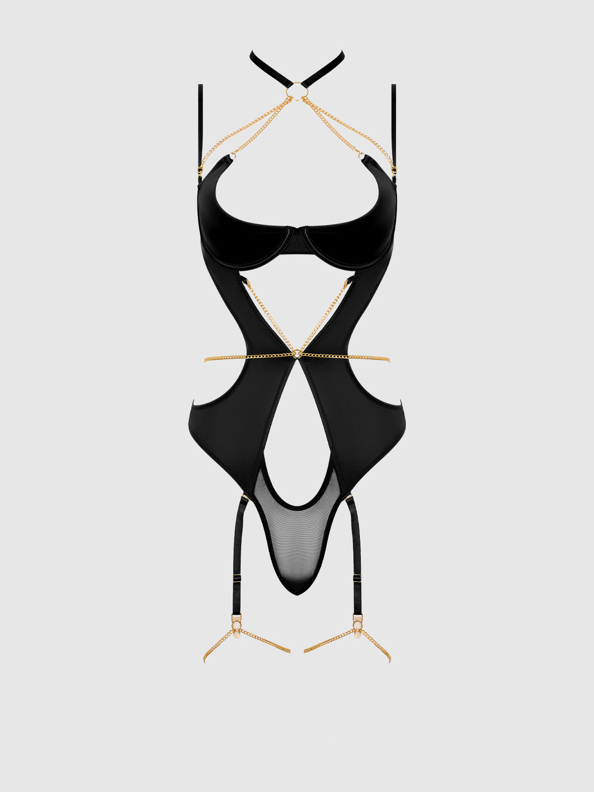 A dangerously sexy one piece, the Evangeline Satin & Chain Halter Teddy elevates the allure with its dreamy fabric and luxe accents. Sleek liquid satin and mesh envelops your figure while gilded chains wrap across the skin, highlighting the bust, waist, and thighs. Adjustable chains customize to your body for a fit that flatters every figure.